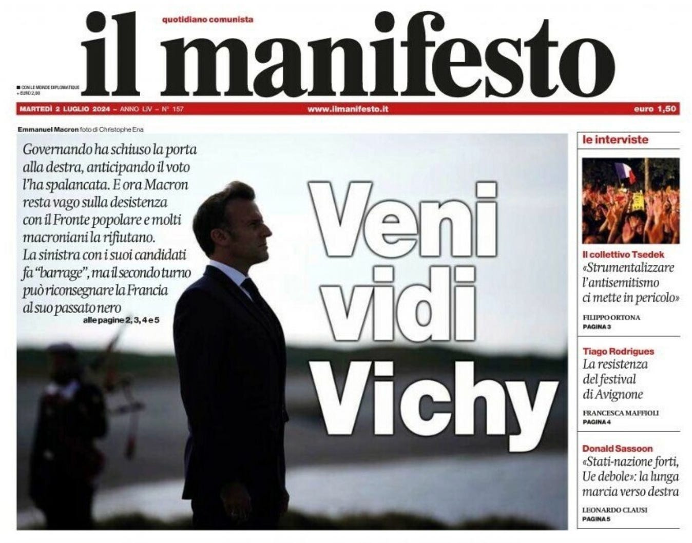 Les médias étrangers témoignent de leur inquiétude de voir l'extrême droite aux portes du pouvoir en France. Le quotidien communiste italien Il Manifesto, fondé en 1969, titre sur ce séisme électoral avec 3 mots "Veni, vidi, Vichy" à côté de la silhouette en profil d'Emmanuel Macron. Cette double référence convoque la célèbre expression latine de l’empereur Jules César "Veni, vidi, vici" signifiant "Je suis venu, j’ai vu, j’ai vaincu" ainsi que le souvenir du régime instauré par les autorités françaises pour assurer la gouvernance du pays lorsque celui-ci était sous occupation nazie durant la Seconde Guerre mondiale. En introduction de son article, le journal analyse le choix fait par le Président de la République de dissoudre l'Assemblée Nationale comme suit "En gouvernant, il a ouvert la porte à la droite. En convoquant des élections anticipées, il l’a grande ouverte. Et maintenant, Macron reste vague sur le désistement de ses candidats face au Nouveau Front populaire. La gauche avec ses candidats fait barrage, mais le second tour peut ramener la France à son sombre passé". Il dresse également un constat alarmant sur la situation dans l'Hexagone, s'indignant du rapprochement entre le "gaulliste" Eric Ciotti et le Rassemblement national, qu'il décrypte comme "le fait pur et simple que la bourgeoisie française (et une grande partie de la bourgeoisie européenne) n’a plus peur des formes contemporaines de fascisme". Un autre quotidien italien, milanais cette fois-ci, Il Foglio, pourtant conservateur et marqué à droite, a choisi de faire sa une sur le président du RN et potentiel futur Premier ministre en cas de majorité absolue dimanche soir, Jordan Bardella, en titrant "Le diable s’habille en Bardella".